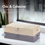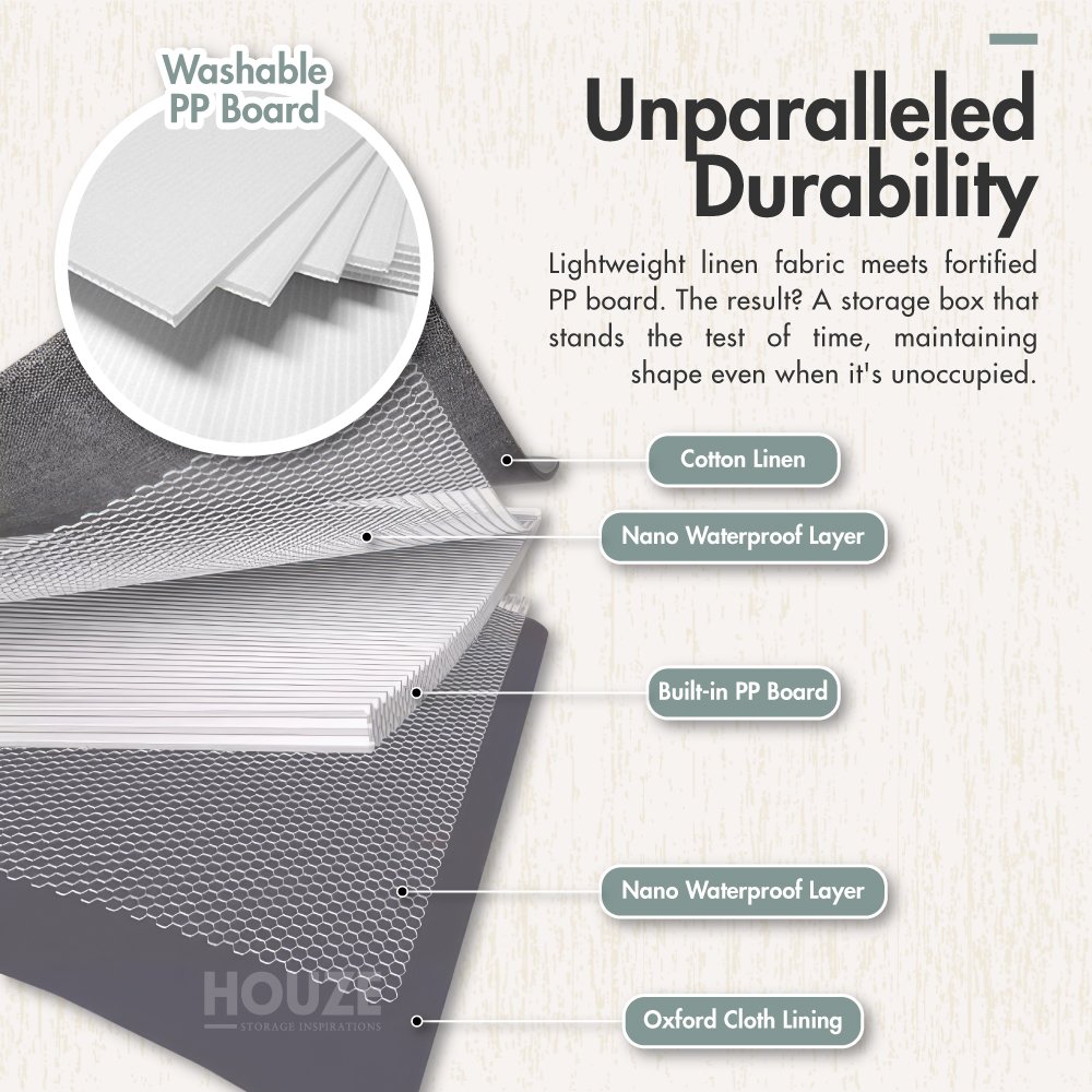 Built to Last: Made from a refined combination of lightweight linen fabric and strengthened with a robust PP board. rest assured that these storage boxes are not just about looks. They promise durability. ready to safeguard those additional beddings. blankets and sheets from the everyday dust and the occasional fuzz-bunny.