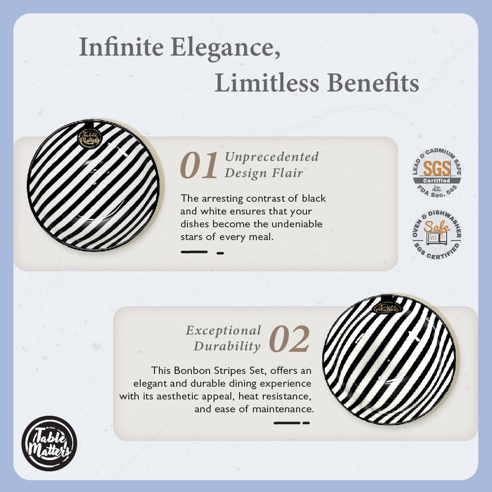 Drawing inspiration from the timeless allure of French Breton stripes. the BonBon Stripes is a blend of simplicity and grace. When paired with the complementary BonBon Dots Collection. your Table becomes an artwork with contrasting patterns that are endlessly stylish. The striking black and white design doesn’t just add to the aesthetics. Still. recent studies indicate that dishes with less contrast to the food intensify the dining experience. making every bite irresistibly delightful.