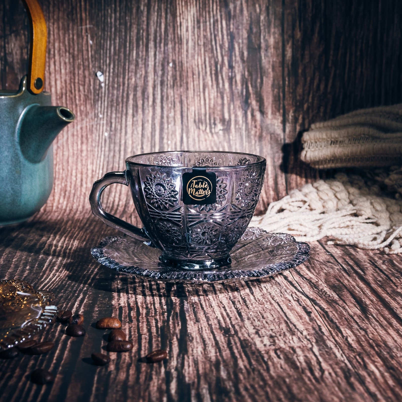 A glass fit for a queen. The TAIKYU lace Glass Cup and Saucer proves that royalty knows no status. Laced with detailed flowers and a flower-shaped saucer. this collection is perfect for reminiscing childhood days of having magical Hi-tea sessions with your friends. Our Taikyu Collection which features a series of durable glassware. Made with high quality and lead-free glass that provides a safer user experience.